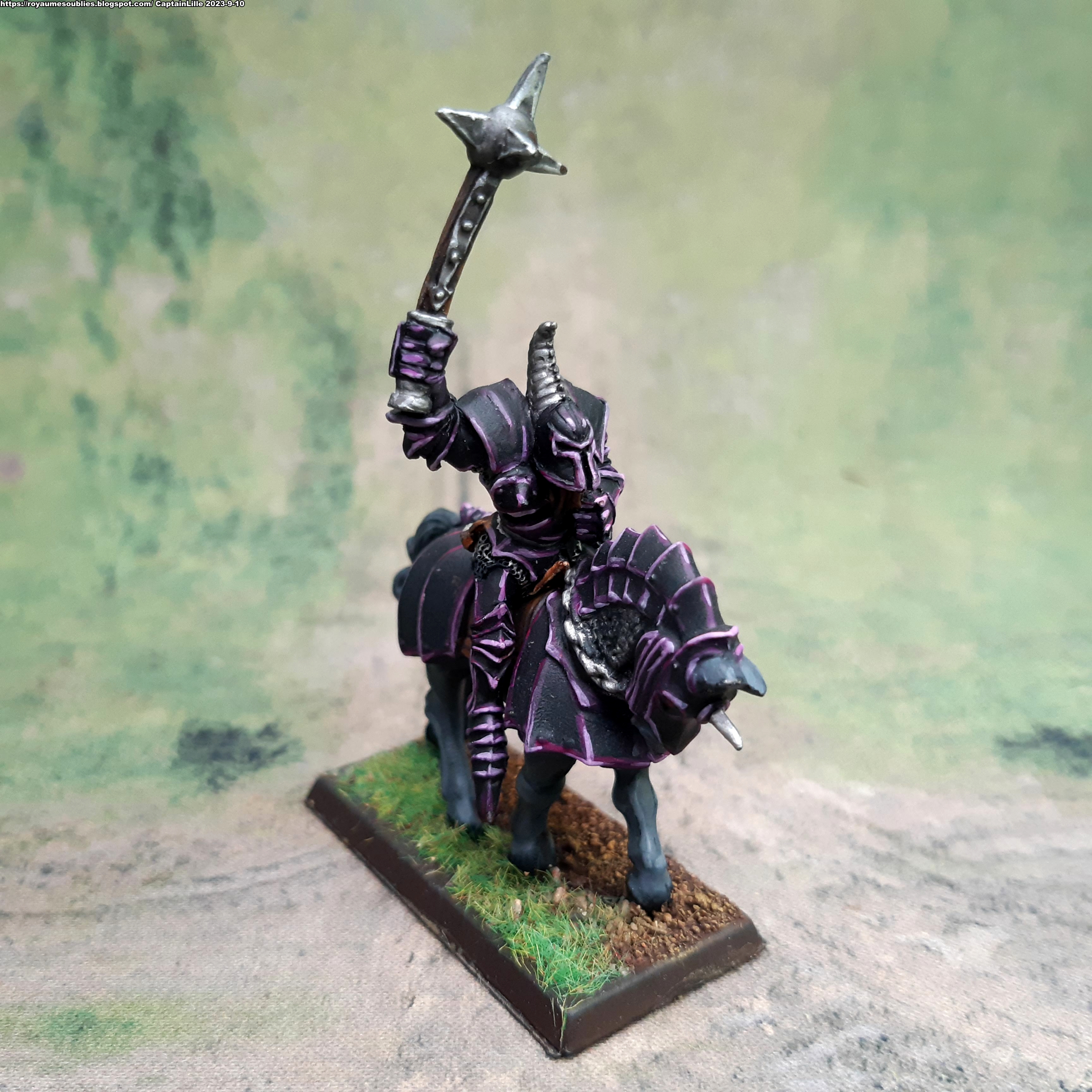 Le chevalier ci-dessous date de la même époque que le char. Il était lui-aussi sur un cheval générique blanc (Et pas sur les superbes destriers du chaos en métal). Je l'ai donc lui aussi mis sur un cheval caparaçonné.